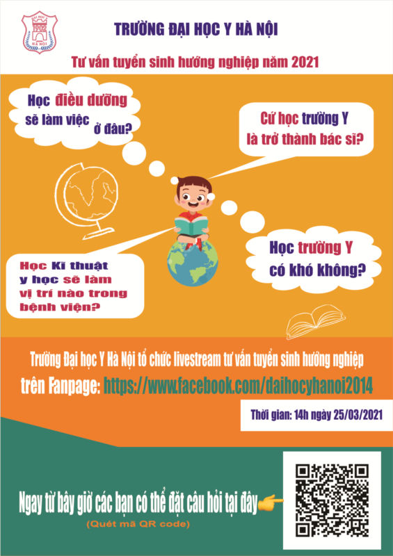 Với mong muốn học sinh khối các trường THPT trong cả nước hiểu rõ hơn về ngành Y nói chung và về Trường Đại học Y Hà Nội nói riêng và cung cấp thông tin hướng nghiệp cho học sinh trước khi quyết định lựa chọn trường Đại học - Vào 14h ngày 25 tháng 3 năm 2021 tại Trường Đại học Y Hà Nội sẽ tổ chức chương trình Tư vấn hướng nghiệp trực tuyến với sự góp mặt của các giảng viên – tư vấn đến từ các Khoa/ Phòng/ Bộ môn của Trường Đại học Y Hà Nội.