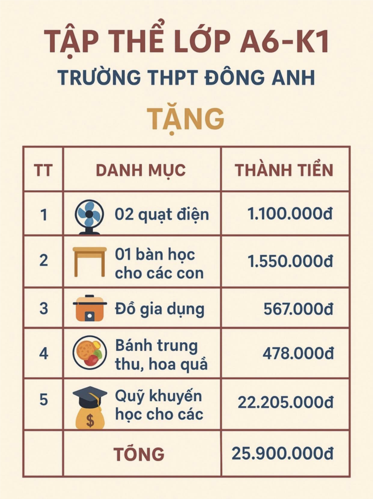 Cảm ơn tập thể lớp A6-K1 vì nghĩa cử cao đẹp – minh chứng cho tinh thần đoàn kết, yêu thương, sẻ chia – những giá trị nhân văn luôn được gìn giữ và lan tỏa trong mái trường THPT Đông Anh thân yêu. ❤️